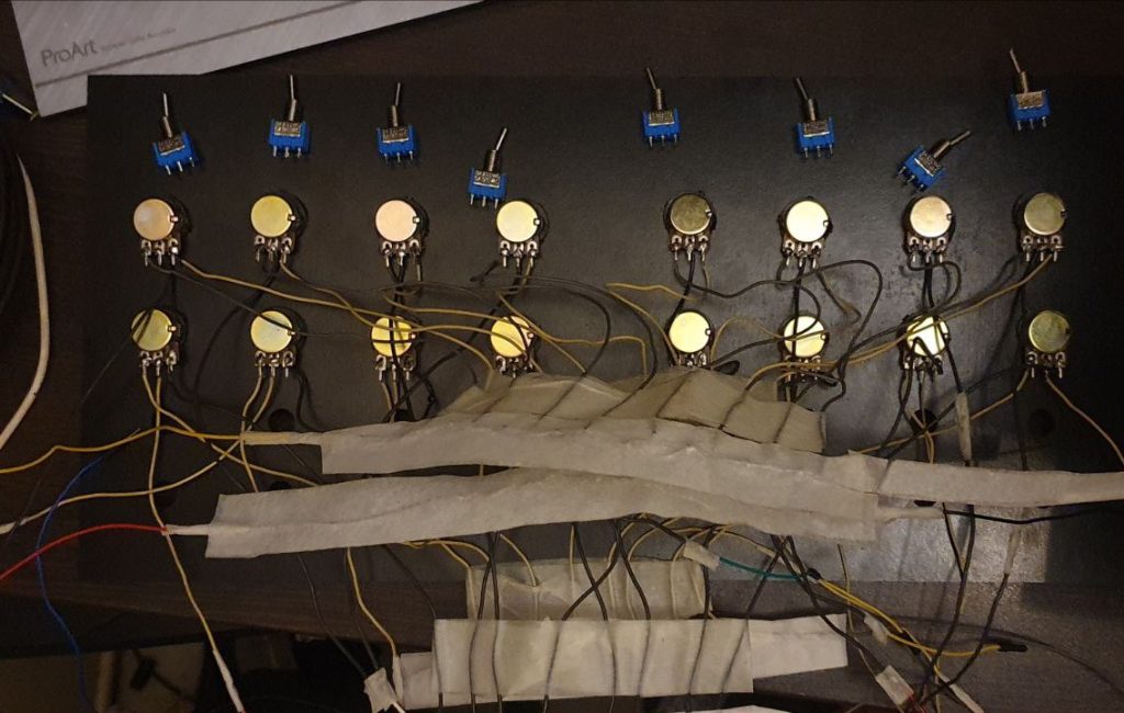 16 Channel midi controller made with arduino, potentiameters, switchs and a mdf body. @hades’sonata